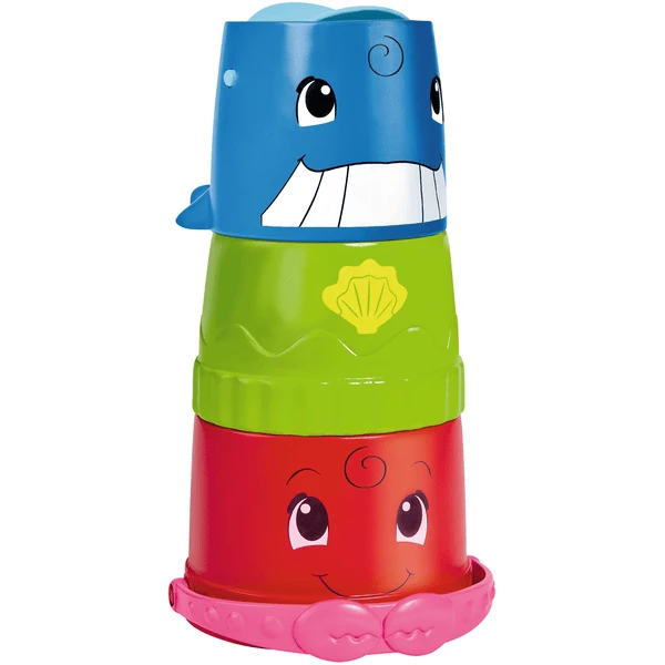 Süße Eimer und bunte Stapelbecher mit Wasserlauf und Wasserrad. Hier kommt beim
